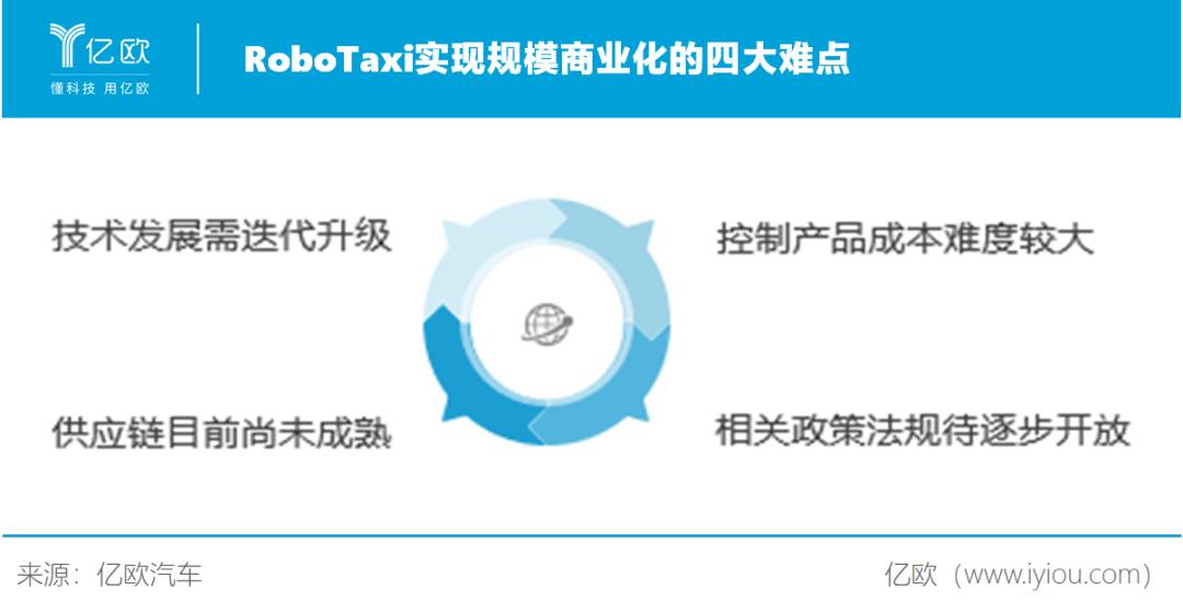 在商业化难题中,目前,RoboTaxi尚未规模化,面临多重阻碍。相较于网约车、出租车等,RoboTaxi目前能够运营的车辆十分有限。当下,RoboTaxi实现规模商业化面临着四大阻碍:一是自动驾驶技术发展需迭代升级;二是控制产品成本难度较大;三是供应链目前尚未成熟;四是受相关政策法规限制,路权有待进一步释放。