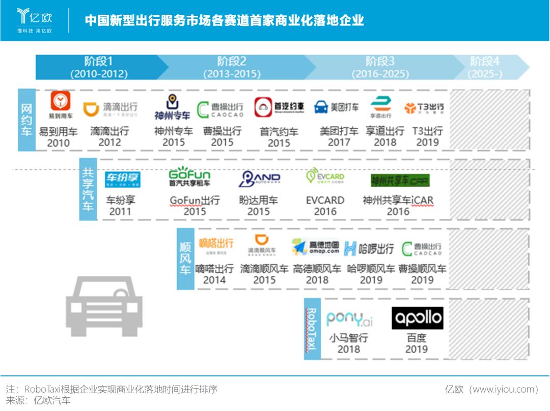 在技术升级、市场需求、政策引导、经济推动等因素驱动下,中国新型出行服务市场随之诞生。网约车、共享汽车、顺风车、RoboTaxi细分赛道在该市场中相继崛起。当下,中国新型出行服务市场玩家交织混战、逐鹿群雄。