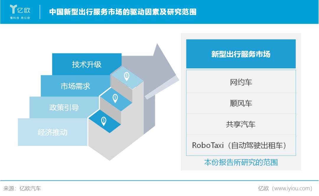 基于对中国出行服务市场多年的行业沉淀与洞察分析,亿欧汽车认为:“新型出行服务市场”是指,2010年以后,由具有营运性质的第三方企业,依托技术升级、市场需求、政策引导、经济推动等因素驱动,满足用户差异化、多场景出行需求,提供乘用车辆移动服务的市场(不包含传统租赁与巡游出租车业务)。