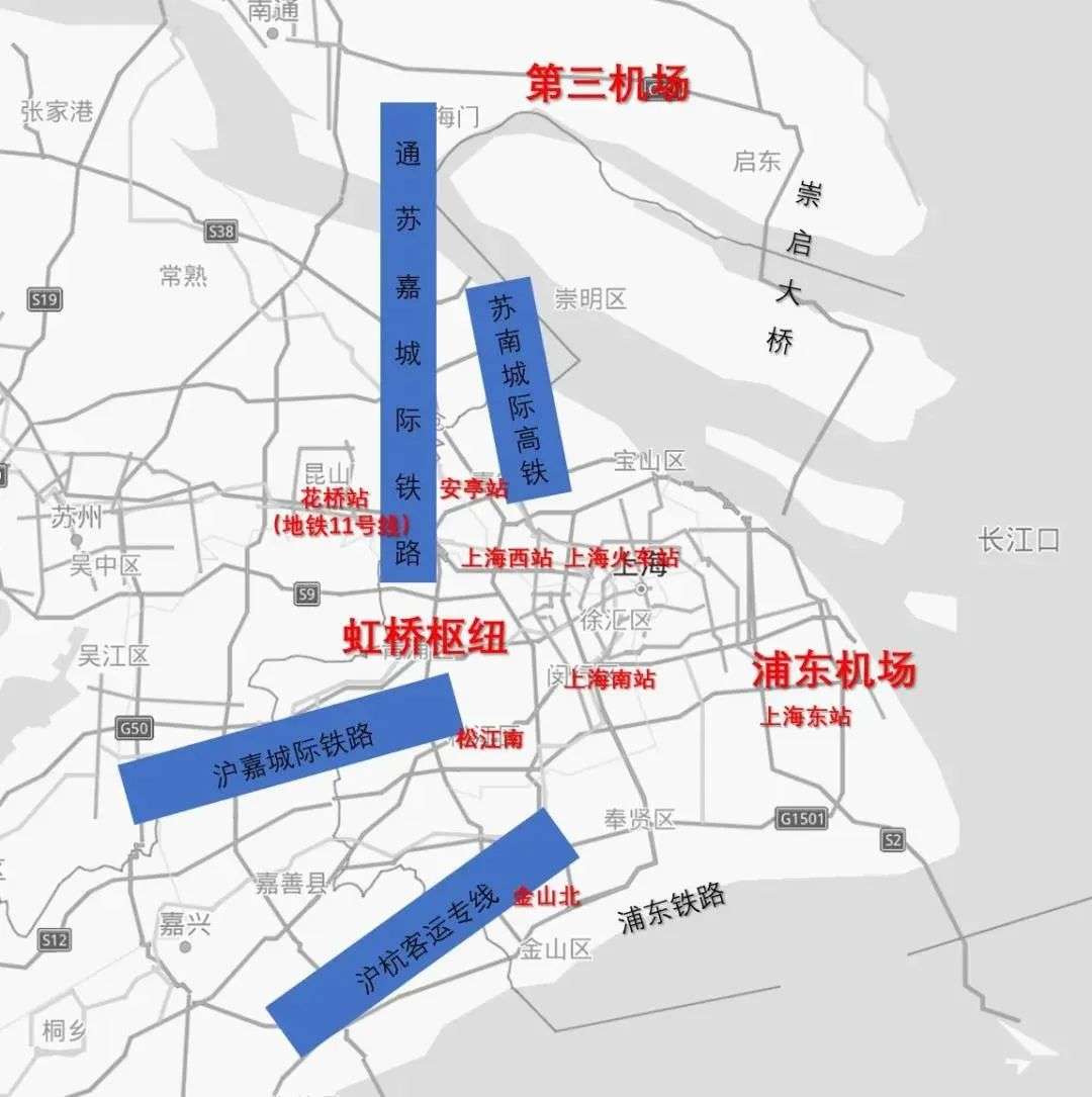 除了沪通高速,未来通过大虹桥往上海各个方向的这些铁路会非常非常多,包括沪嘉城际铁路。