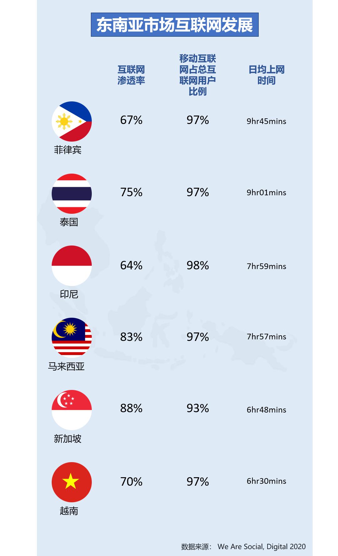 调研机构 We Are Social 发布的 Digital 2020 系列报告数据显示,新加坡和马来西亚的互联网渗透率皆已超过80%。印尼用户基数大,然而整体互联网渗透率与其他国家相比偏低,这也意味着未来有很大的发展空间。