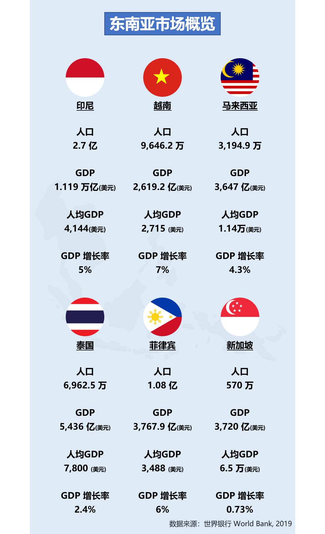 根据世界银行2019年最新数据,马来西亚和新加坡的消费能力较高,人均 GDP 皆超过世界平均水平。马来西亚人均 GDP 突破1.1万美元,新加坡人均 GDP 超过6.5万美元,位居亚洲第一。从市场规模和体量来看,印尼拥有2.7亿人口,是世界第四人口大国。如果从经济成长增速表现的角度分析,连续两年 GDP 年增长率维持在7%的越南,是东南亚GDP增长最快的地区,也是十分有潜力的市场。