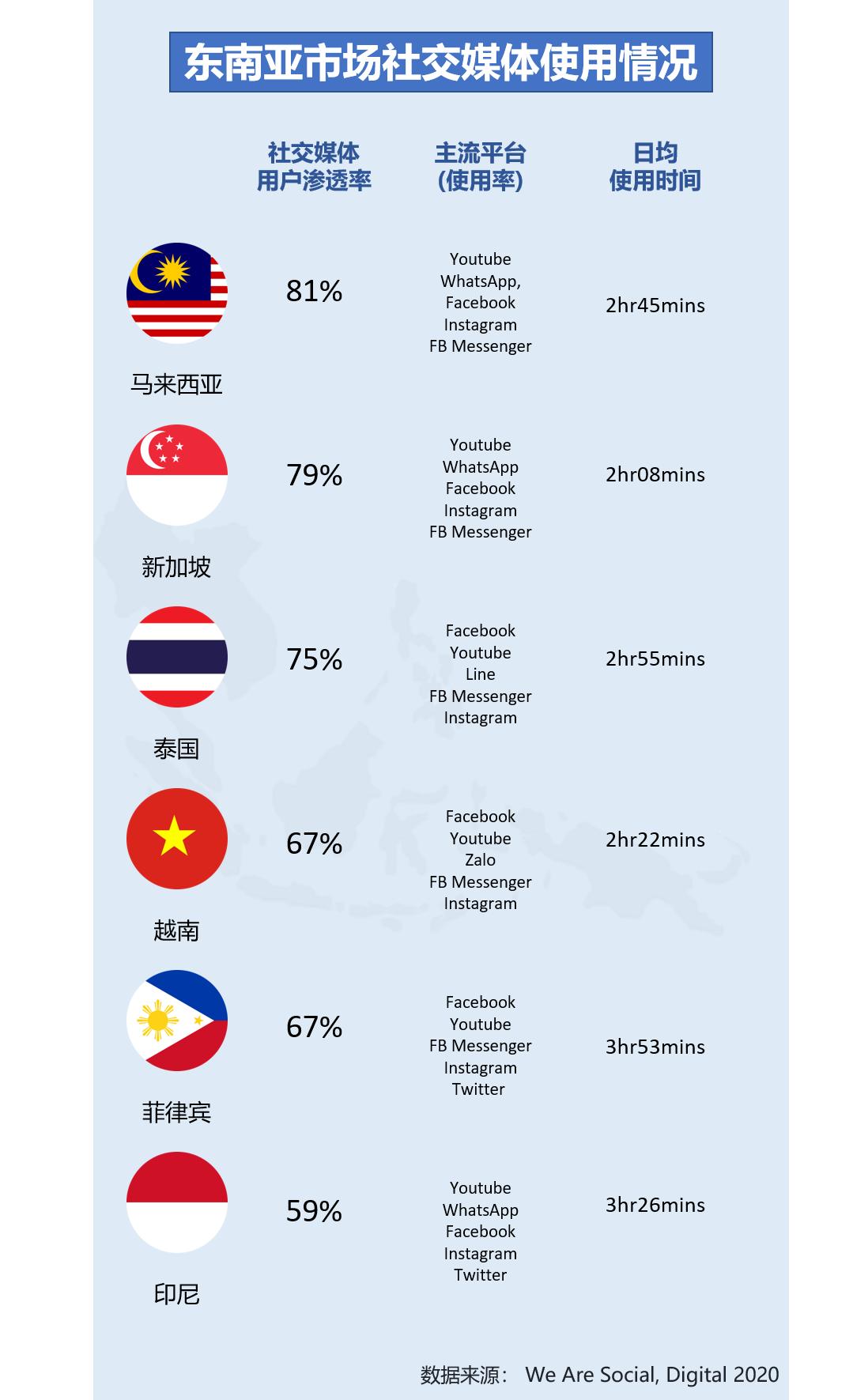 从社交媒体的日均使用时长来看,印尼、菲律宾、泰国名列前三。整个东南亚的社交媒体大多被美国主流平台“垄断”,除了越南有 Zalo、泰国有韩国的 Line 之外,Youtube、WhatsApp、Facebook、Instagram 和 Twitter 是这些市场中的主流平台。