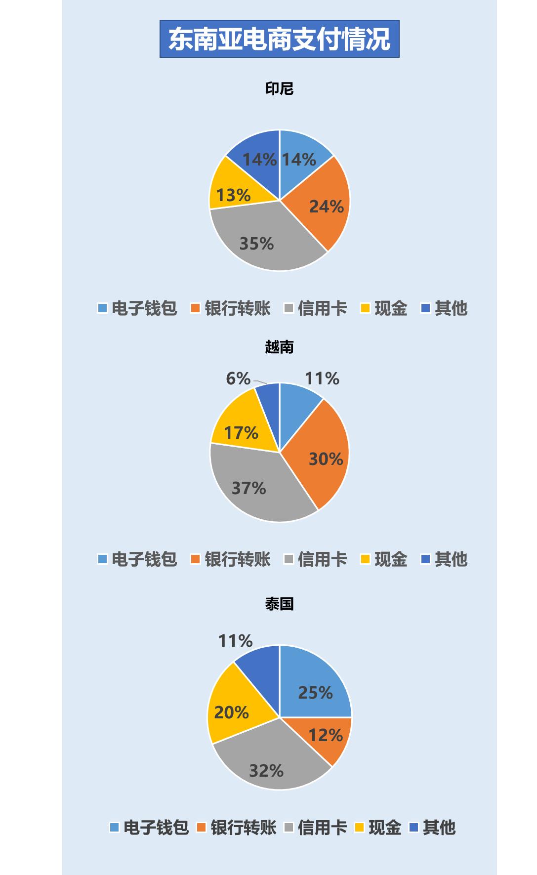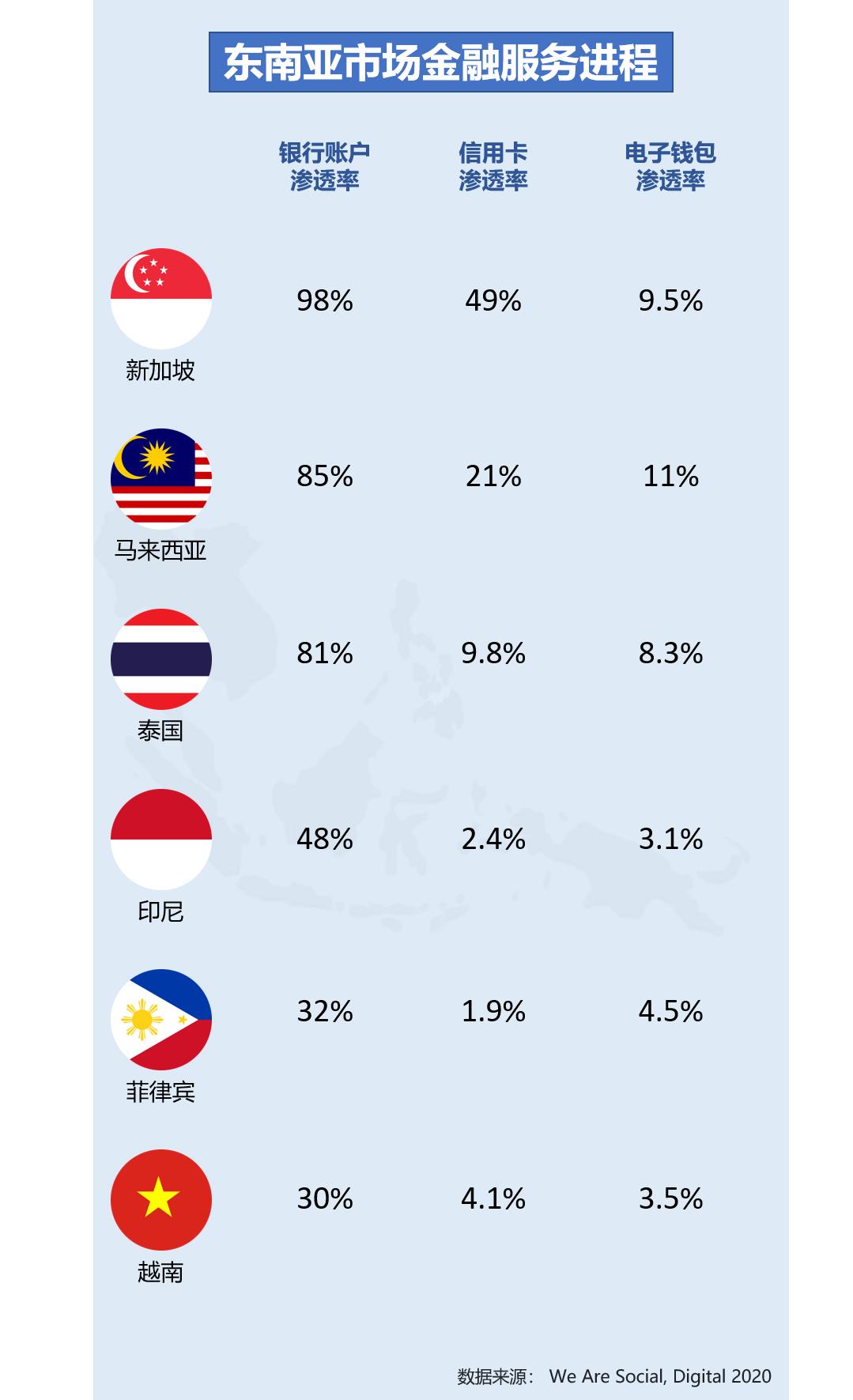 除了互联网渗透率之外,金融服务的普及程度也会影响电商的发展。东南亚各地区的金融服务存在较明显的差距,新加坡、马来西亚和泰国的银行账户渗透率已经突破80%,而越南银行账户渗透率仅为30%。除此之外,新加坡、马来西亚和泰国地区的电子钱包渗透率也明显高于印尼、越南和菲律宾地区。