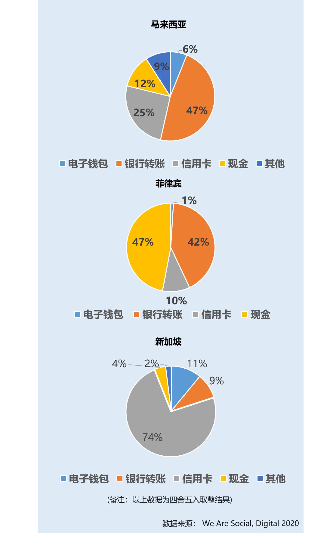 电商交易的付款方式与各地区金融服务的发展也存在一定的关联性,例如,菲律宾用现金付款的比例偏高,目前还是有47%的交易通过现金进行;在泰国,Line 的活跃带动了其内置钱包功能的推广;新加坡类似欧美成熟市场,主要的支付手段以信用卡为主,有74%的交易通过信用卡进行。