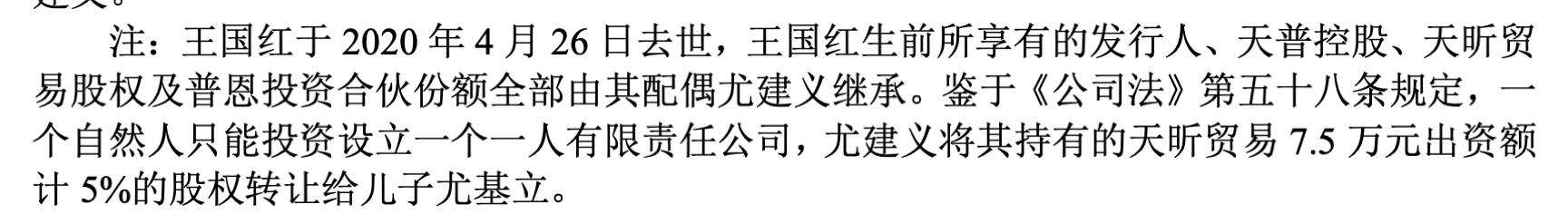 但不幸的是,妻子并没有见证到最后的成功。根据招股书,王国红于 2020 年4月26日去世,王国红生前所享有的发行人、天普控股、天昕贸易股权及普恩投资合伙份额全部由其配偶尤建义继承。