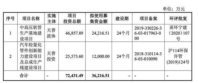 但是根据招股书,天普股份本次募集资金拟用于中高压软管生产基地建设项目、汽车轻量化管件创新能力建设项目及总成生产线建设项目。