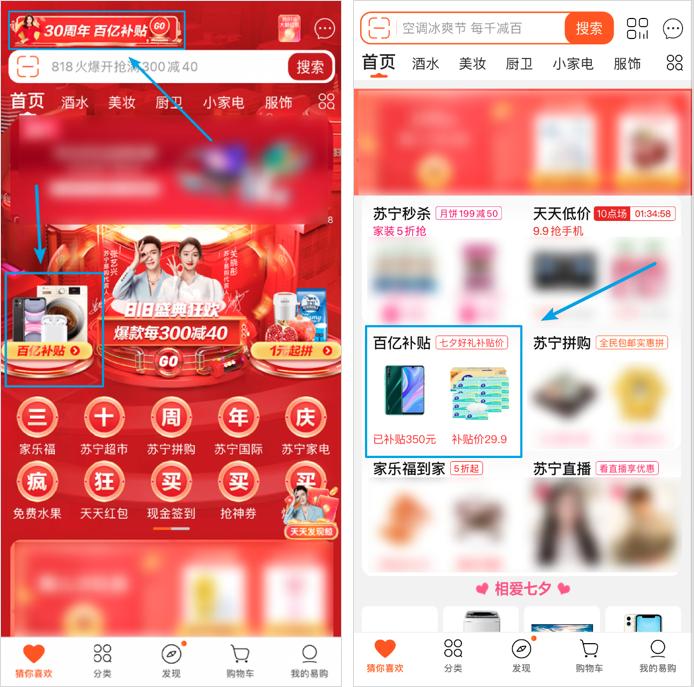 相比京东,苏宁的百亿补贴反而比较常态化。818 期间,百亿补贴有在 App 首页第一屏就有 2 个入口。818 活动结束后,百亿补贴移到了 App 首页第二屏,位置不算突出,但也算是重要活动了。