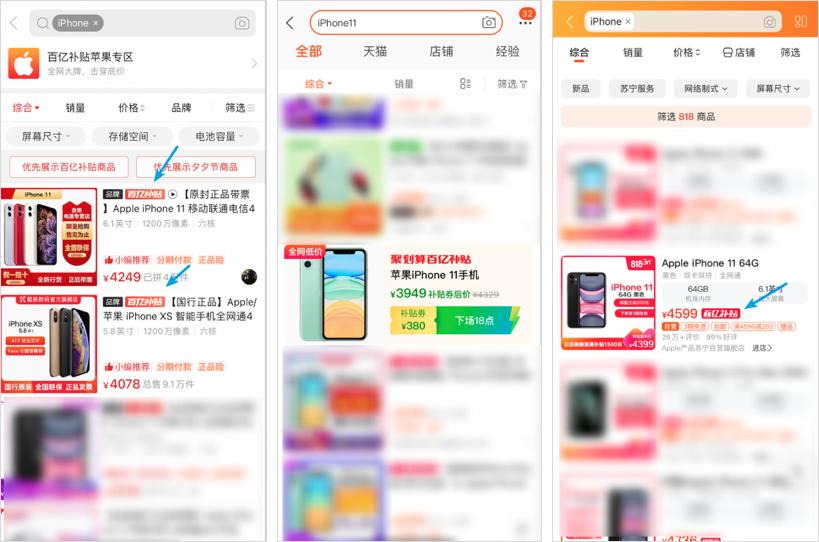除了 App 直接呈现入口之外,拼多多、淘宝和苏宁的用户还可以在搜索某个商品时,发现百亿补贴商品。
