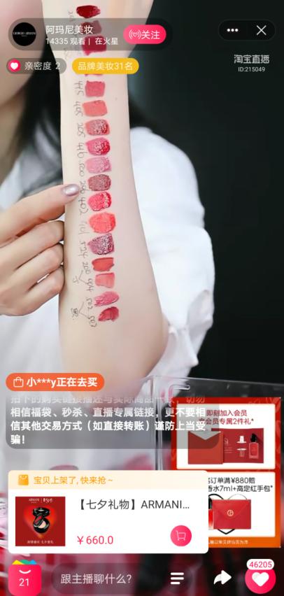 另一头,早已加入天猫的阿玛尼彩妆已把直播营销玩的炉火纯青,不像今年刚入局的卡地亚、伯爵、Prada、巴黎世家、宝格丽、迪奥美妆般青涩,阿玛尼的旗舰店始终进行着七夕直播带货,专业的店铺主播和试色、竖屏内容,在和直播间网友对话时,女主播还多次强调:“易烊千玺的签名海报没有啦,但我们之后会和领导申请,大家懂得。”