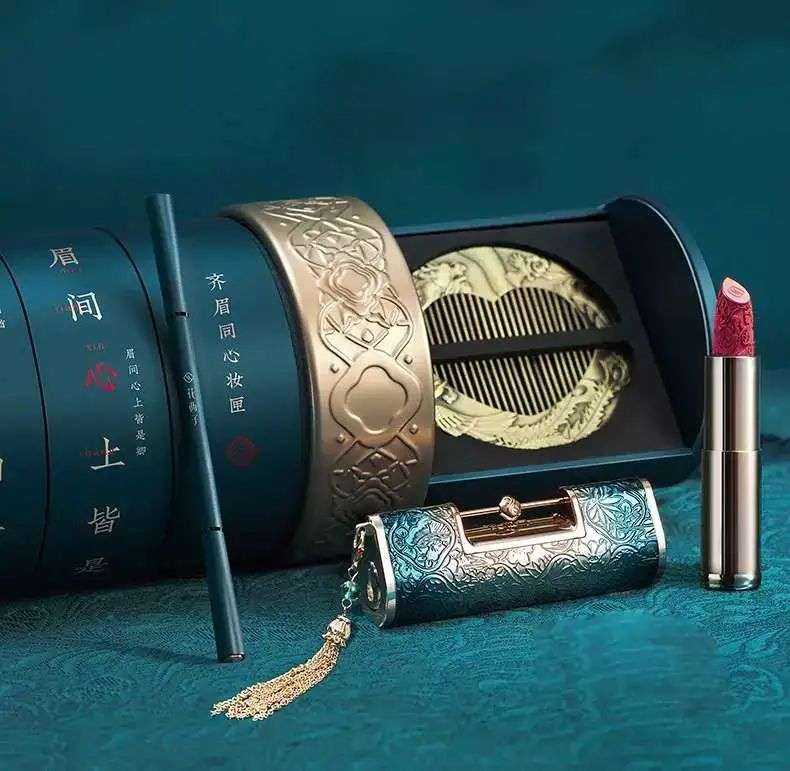 在戳中广大国内女性受众审美点上,国牌愈发走在前列。花西子的“齐眉同心”妆匣主打定情礼,古风意味充裕,上线即秒空。百雀羚和周大福的跨界联名礼盒也备受关注,同样国风浓郁。