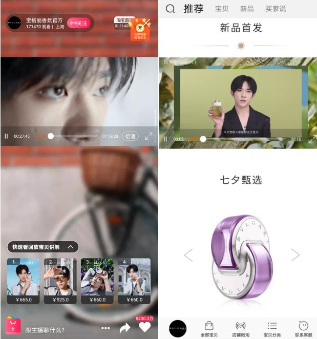 于是,宝格丽香氛线在今年4月正式入住天猫旗舰店后,把代言人易烊千玺的官宣直播放在了宣传首页。点开直播,女主持优雅介绍 “关注宝格丽官方旗舰店并成为会员,便有机会获得代言人易烊千玺亲笔签名的明信片”。