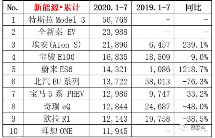 乘联会数据显示,7月份这款车共售出了3685辆,去年同期为3406辆,同比增长8.2%,1月~7月,这款车共售出了21896辆,比去年同期的6457辆增长了239.1%,稳居国内新能源销量榜的第三名。