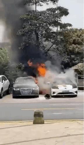 今年5月18日下午,一辆广汽Aion S在广州杨桃公园一停车场内起火,大量的明火包围了车辆并且还发生了小程度的爆炸,甚至殃及了停在旁边的一辆奥迪A6L,最终车辆被烧的只剩下车壳。