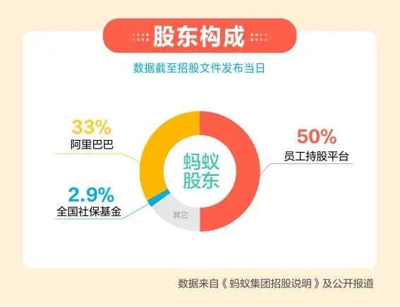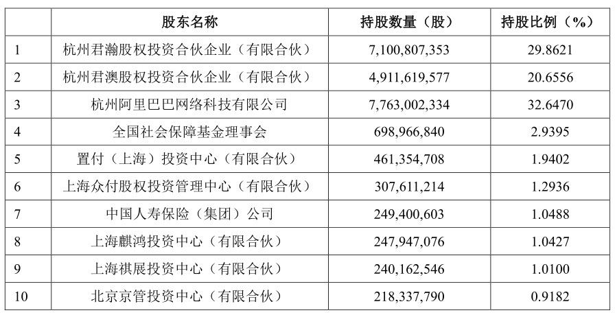 招股文件还披露了蚂蚁集团最新的股东构成情况。截至招股文件发布之日,君瀚、君澳作为蚂蚁的员工持股平台,分别持有蚂蚁29.8%和20.6%的股份,为控股股东。发行完成后,君瀚、君澳合计持股将不低于40%。