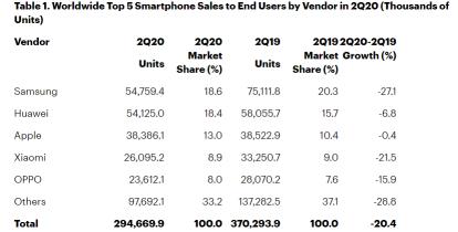 8月25日,行业分析机构Gartner发布的数据显示,2020年第二季度,全球智能手机销量同比下跌20.4%,从3亿7千万部下跌至2亿9千万部,前五大手机厂商均出现不同程度下滑。