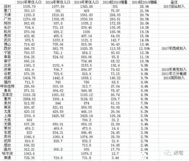 人口增速在前十名的城市,每年的人口增速都在20万以上。