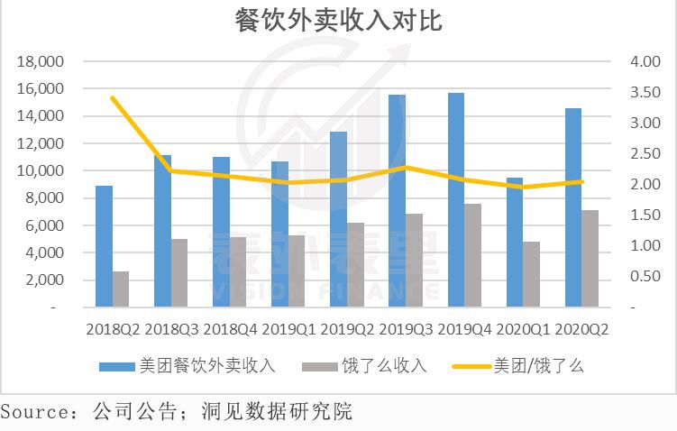 其次,在收入绝对值上,美团之于饿了么的差距也在缩小。如上图所示,2018Q2,两者收入差达到3.41倍,而这个倍数在2020Q2 为2.05倍。