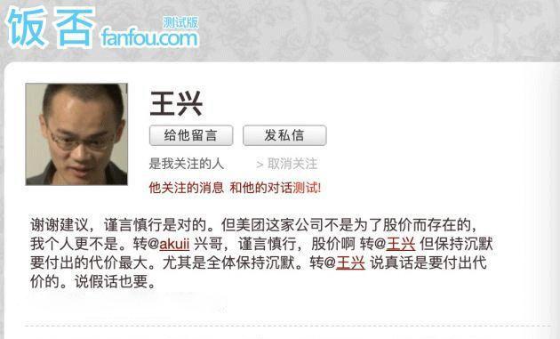 8月4日,美团创始人王兴在饭否谈及美团股价时表示:“美团这家公司不是为了股价而存在的,我个人更不是。”