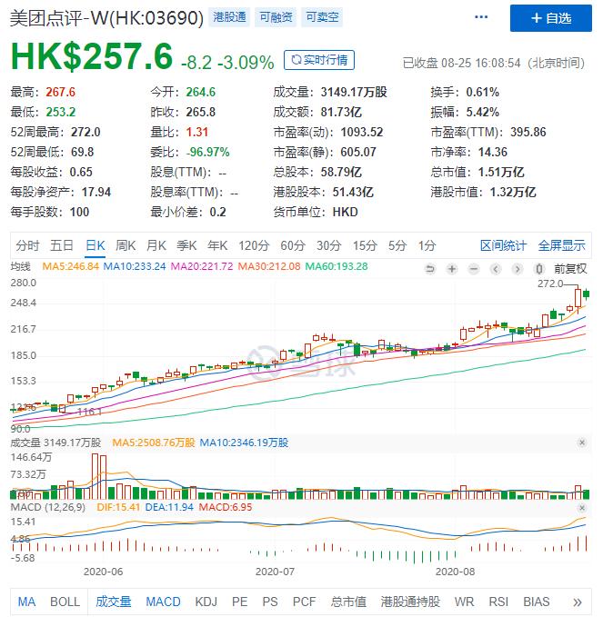 上周五(8月21日),美团Q2财报发布,摆脱疫情的阴影,总营收实现同比增长9%。周一开市(8月24日)美团股票大涨8.4%,股价达历史高点272港元。
