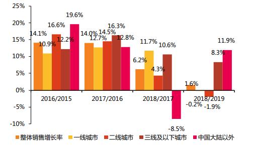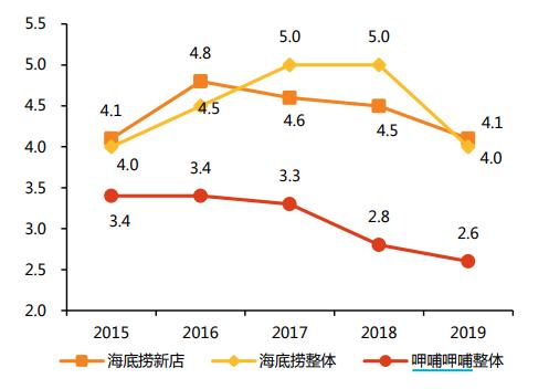 一方面,翻台率首次下降,2019年海底捞整体的翻台率为4.8次/天,一线城市由5.1次/天下滑至4.7次/天,二线城市由5.3次/天下滑至4.9次/天;一线和二线城市门店的同店销售增长率也出现首次负值(分别为-0.2%和-1.9%),一改2018年的积极趋势(分别是11.7%和4.3%)。