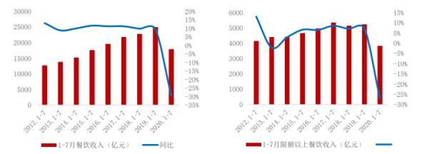 “今年1-7月全国餐饮收入17891亿元,同比下降29.6%...1-7月全国餐饮收入增速较上年同期下降29.6个百分点,相比社会消费品零售总额增幅(-9.9%),全国餐饮市场增幅低于整个消费市场增幅19.7个百分点。——国家统计局