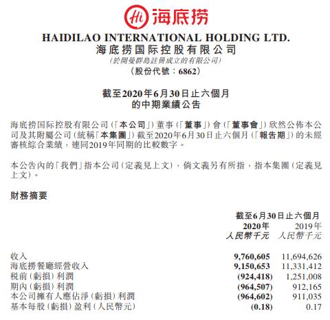 与此同时,海底捞也正式迎来了中报业绩,由盈转亏,惨遭滑铁卢,符合此前的业绩预警,没有悬念。