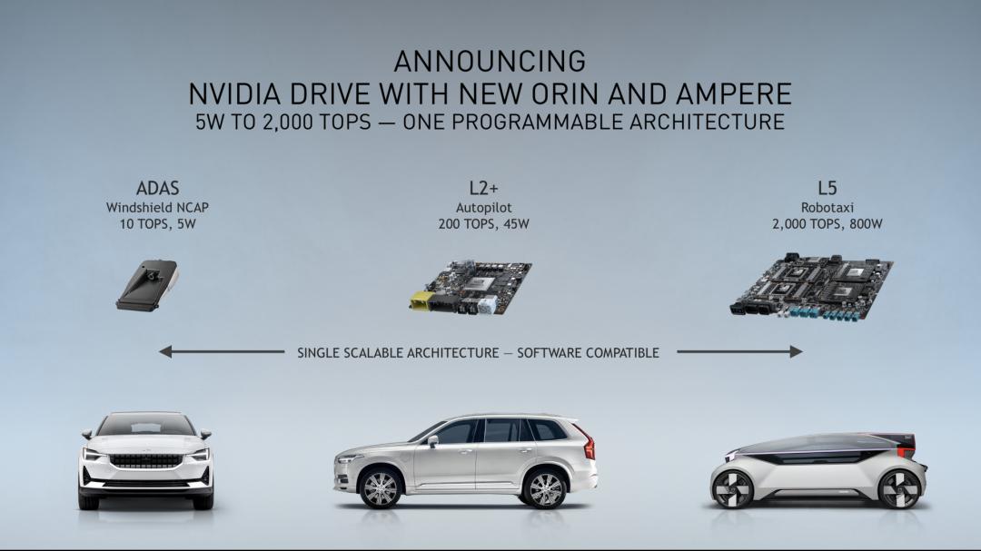 后来老黄奋发图强,在今年的厨房发布会上,大举推发布了目前世界上算力最强的自动驾驶芯片方案——Drive AGX Robotaxi,算力 2000TOPS,但功耗高达800W,剑指L5级自动驾驶!