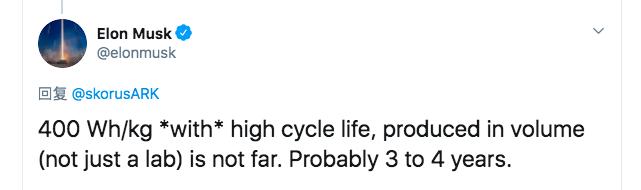 特斯拉备受期待的电池日(Battery Day)即将到来,马斯克也给大家漏了点口风:批量生产400Wh/kg的高寿命电池并不遥远,可能需要3到4年。