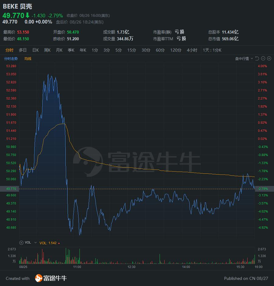 近期股价一路攀高的$贝壳(BEKE.US)$周三早盘再度冲高,股价最高涨至53.15元,创上市以来新高。但随后盘中股价跳水,一度跌超5%,最终收跌2.79%,市值为569亿美元。