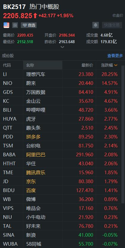 知名中概股多数上涨,其中阿里巴巴报291.96美元,涨幅为2.08%;百度报127.47美元,涨幅为1.41%;京东报80.38美元,涨幅为1.79%;网易报514.01美元,涨幅为0.26%;拼多多报89.25美元,涨幅为2.3%;蔚来报20.44美元,涨幅为14.57%;理想汽车报23.38美元,涨幅为28.25%。