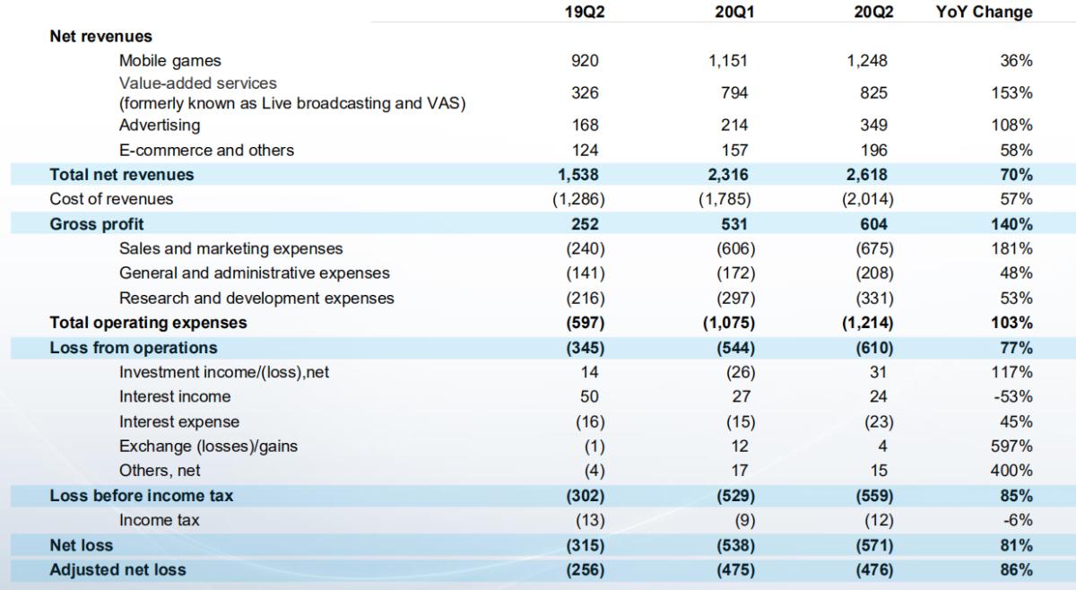 周三美股盘后,$哔哩哔哩(BILI.US)$公布2020年Q2业绩,营收26.2亿元,同比增长70%;调整后净亏损4.76亿元,而2019年同期为2.56亿元,同比扩大86%。
