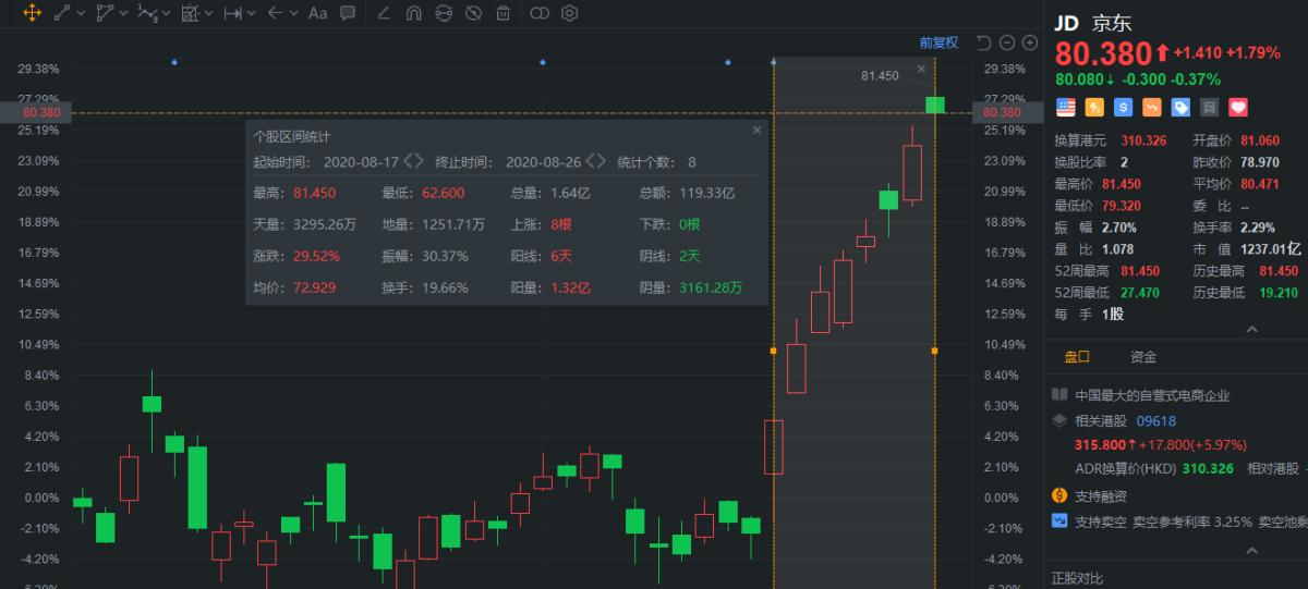 阿里巴巴延续近期上涨趋势,周三美股再创历史新高,收涨2.08%,收盘市值达7896亿美元。京东美股也于周三创下新高,发布二季度业绩后累计涨幅已近30%。
