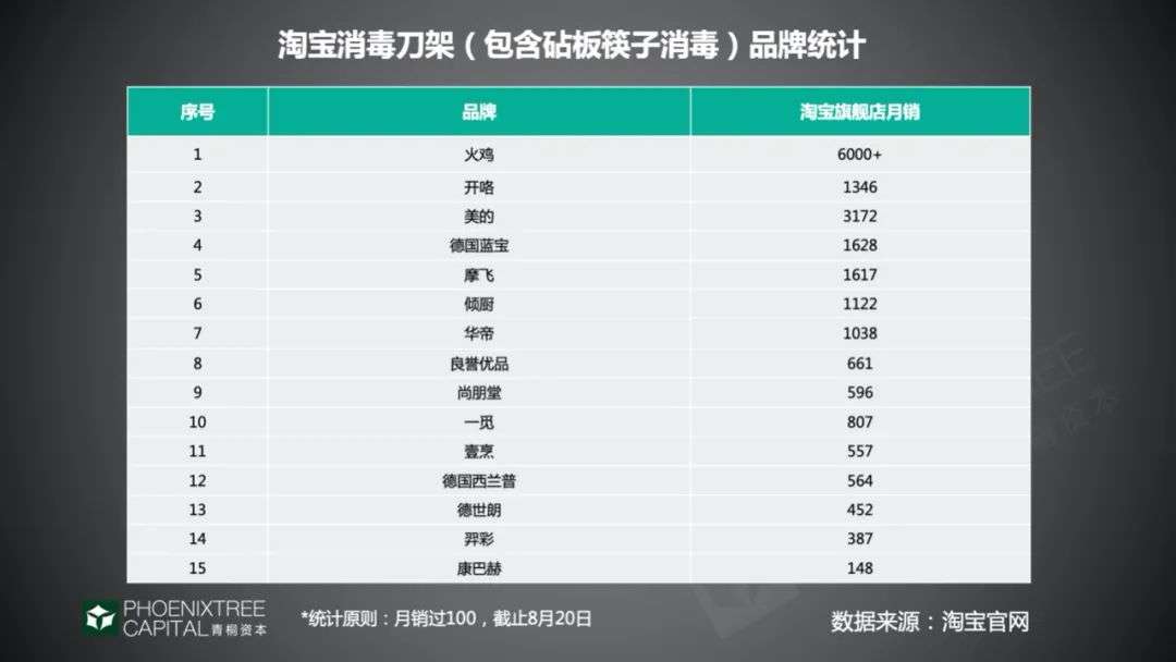 新兴消杀品类也格外火爆,消毒刀架销量翻4倍。消毒刀架这一新品类诞生于2019年,不仅仅局限于刀具消毒,还包括砧板、筷子等消毒。短短一年销量快速增长,据淘系数据,今年3月消毒刀架的销售额近9000万元,是2019年销量的4倍。从玩家来看,青桐资本整理发现,淘宝月销过百的消毒刀架中,已有近15个品牌。国内创业公司纷纷入场,其中火鸡、一觅都是以消毒刀架为主打产品的新品牌,一觅还创新增加了砧板消毒功能。