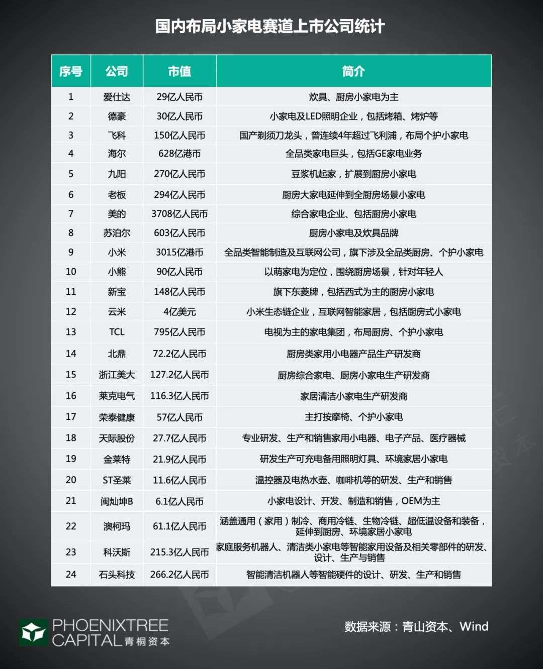 二级市场上,据青山资本统计,国内共24家上市公司布局小家电赛道,其中6家公司以小家电起家,小熊、新宝在中小板上市,莱克电气、科沃斯登陆A股主板,石头科技、北鼎今年分别成功冲击科创板、创业板。