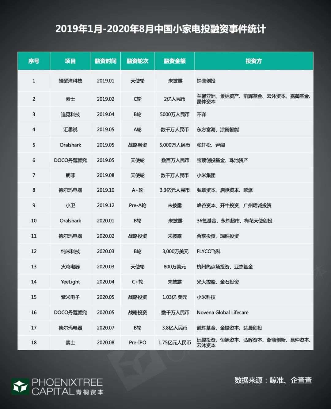 纵观2020年其融资事件,呈现3大特点:首先,战略投资明显变多,共3起,主要出于寻找优质供应链或品牌的需求;其次,新兴品牌受到热捧,其中素士、Oralshark2019年迄今分别完成2轮融资,德尔玛电器则成功连融3轮。再者,产业资本活跃,如小米投资朗菲、紫米2个项目,涂鸦智能投资汇思锐。