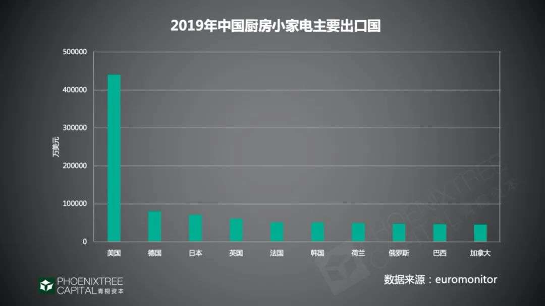 从出海区域来看,欧美是主要出口地,中国机电产品进出口商会数据显示,2019年中国厨房小家十大出口国中,美国以近45亿美元位列第一,欧美国家占80%。欧美消费能力高,本身对品类有认知,小家电需求大,期望性价比更高的产品,是中国小家电主要出口欧美的原因。另据euromonitor数据,2019年全球各国小家电消费需求,美、德、英、法四国占近69%。