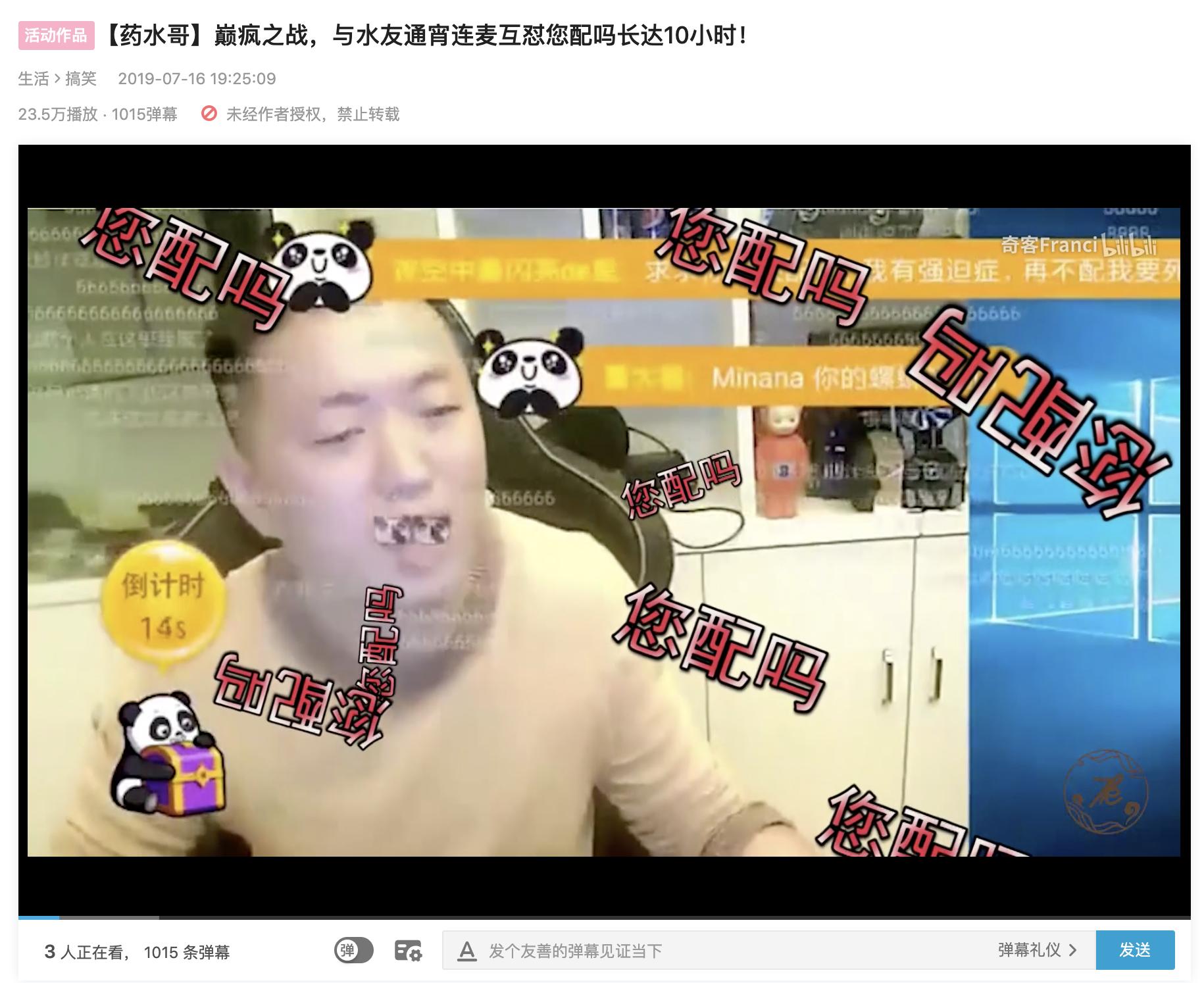 药水哥与水友对喷 7 小时录屏视频在 B 站有很高的播放量