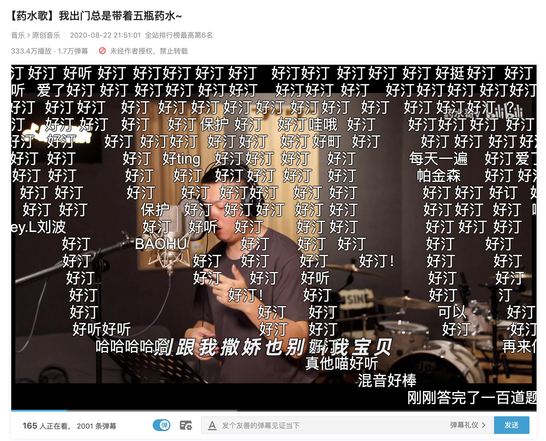 第二天,药水哥在 B 站的官方账号发布了这首歌的 MV。到目前为止,视频已经被播放了 333.4 万次,生成了 1.7 万条弹幕,密密麻麻的“好汀(听)”几乎要将他的身影淹没。
