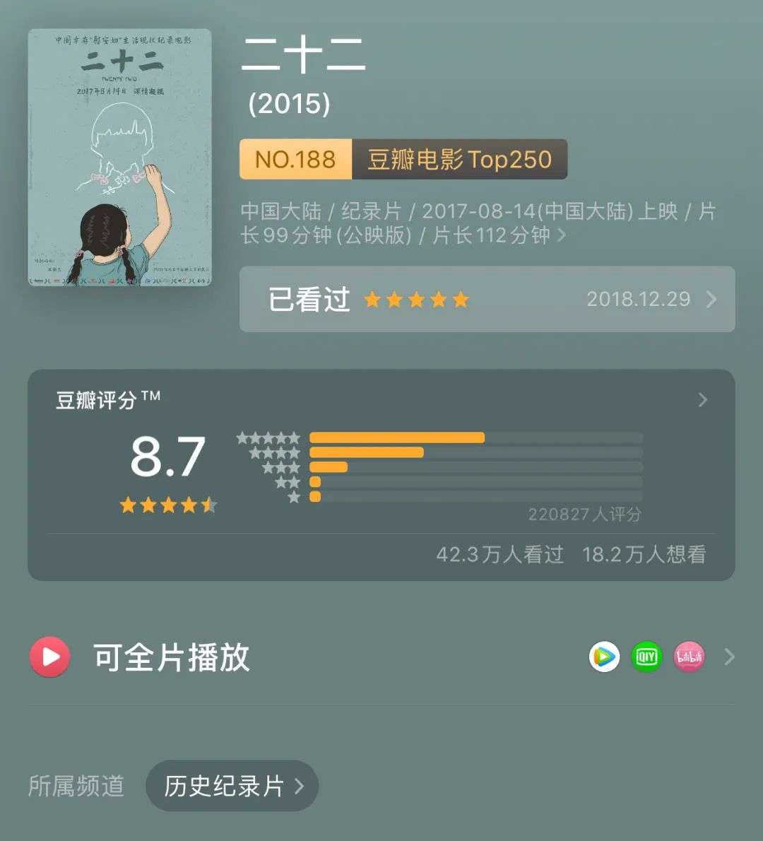 郭柯导演拍摄的中国慰安妇主题纪录片《二十二》,图片来源:豆瓣APP截图。