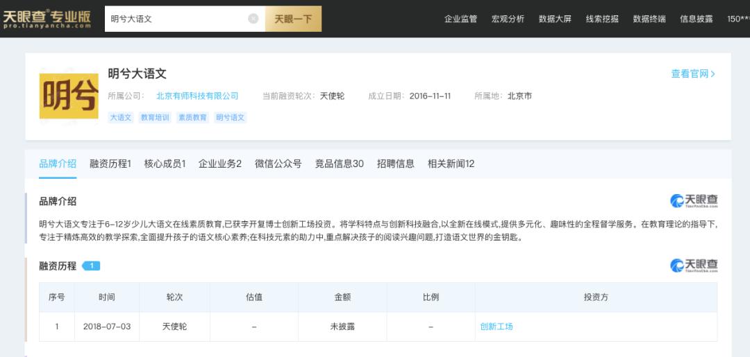 今年二月,曾被誉为大语文赛道黑马的“明兮大语文”轰然倒下。据天眼查专业版数据显示,“明兮大语文”曾于2018年7月获得创新工场李开复投资,融资金额未披露,却因18年之后再拿不到新的融资而倒下。这样的结果令人唏嘘不已。