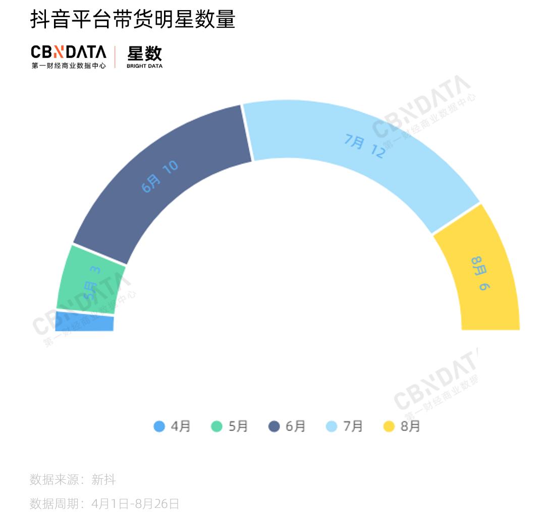 而在今年发力直播带货的抖音平台,趋势更为明显。CBNData统计了近两个月在抖音上进行直播带货的明星发现,6、7月份该平台的明星直播带货达到了高潮,7月份达到了12组,而进入8月,这一频率有了明显下降,只有5组。