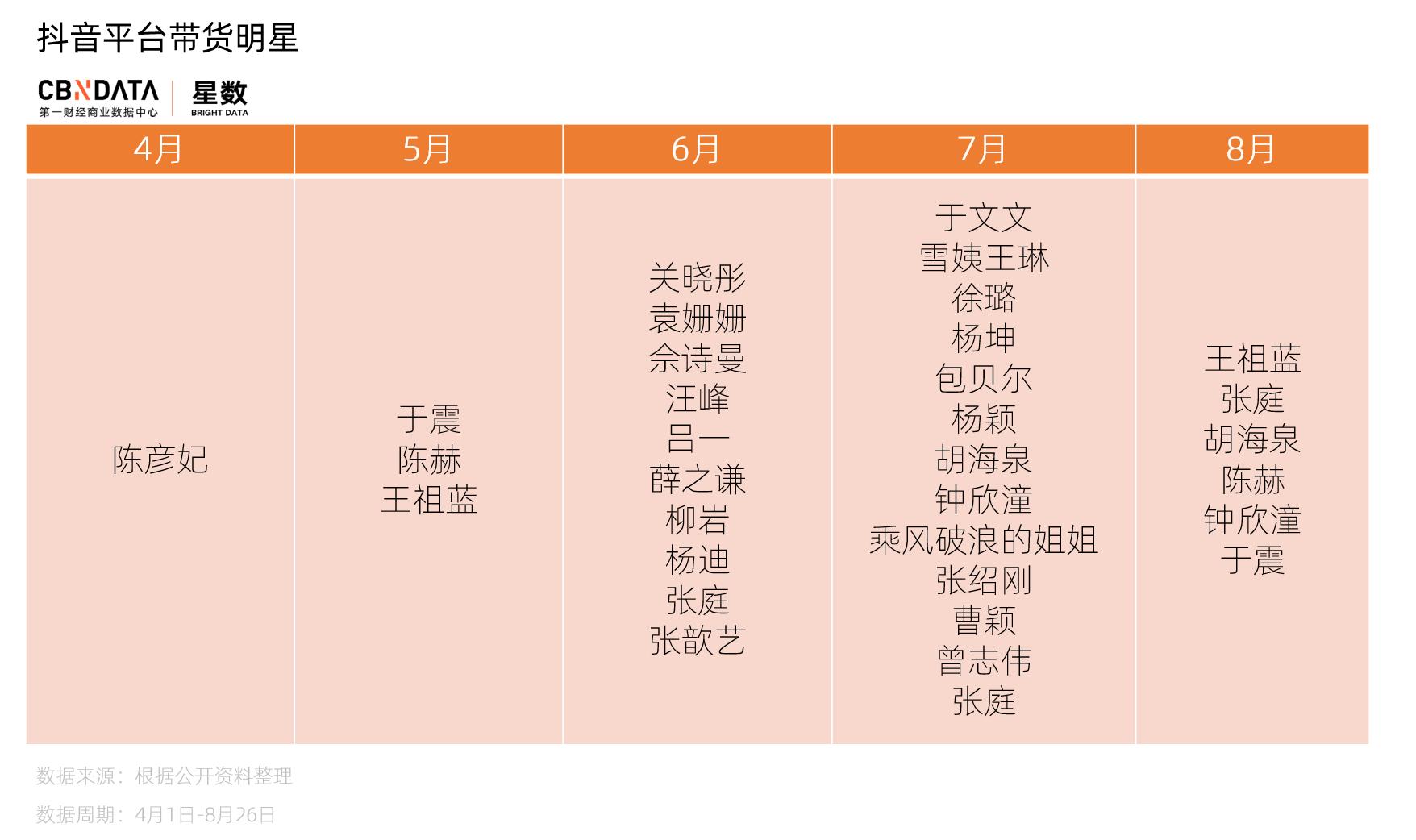 梳理详细名单不难发现,6、7月份的带货关键词是首秀,汪峰、袁姗姗、杨颖等明星的首次带货直播均在一定范围内掀起了热议。而8月份该平台上的带货明星主要是陈赫、王祖蓝等老面孔,新入局者锐减。