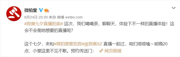 8月25日,郑爽在一个文玩领域的线上直播拍卖鉴宝平台进行了直播。或许是受到舆论压力,该品牌在进行直播预热宣传时,多次强调该次直播将以聊天为主,带货不重要,还曾卑微发问,“这会不会是她想要的直播呢”?