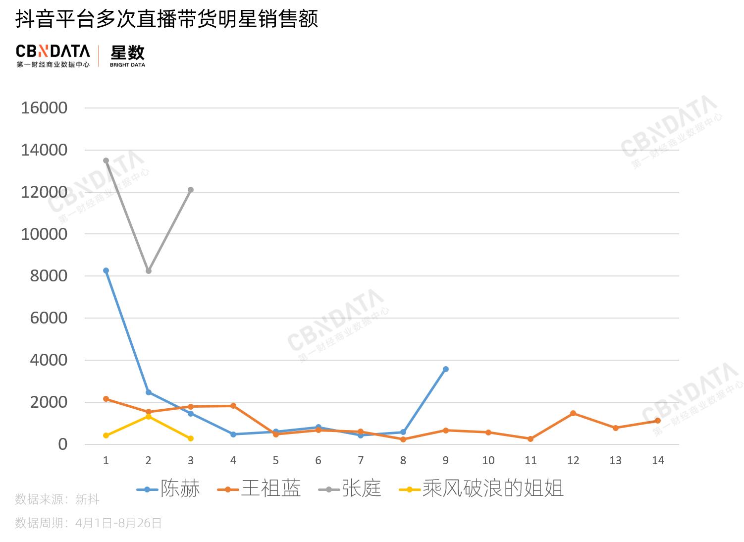 除了明星带货直播的场次减少,在带货表现方面是否呈现明显变化呢?以在抖音上直播过多场的陈赫、王祖蓝、张庭以及乘风破浪的姐姐直播间为例,在最近一场的直播带货中,前三位明星的带货金额相对有了不少提升,上涨曲线皆落在了8月份。或许可以认为,当入局者锐减,流量与购买力也会集中于更为专业的头部明星身上,而他们也是大浪淘沙过后能够真正在带货界站住脚的明星。