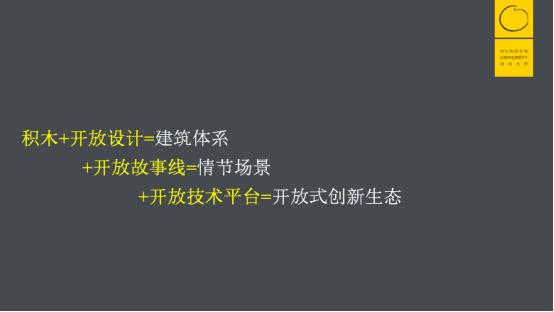 我们看这张图,积木加上开放设计,就得到了建筑体系;建筑体系再加上开放故事线,就得到了情节场景;情节场景再加上开放技术平台,就得到了开放式创新生态。