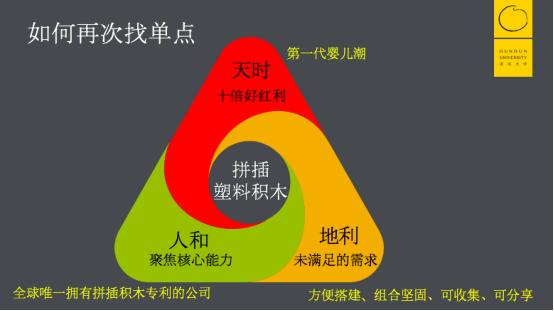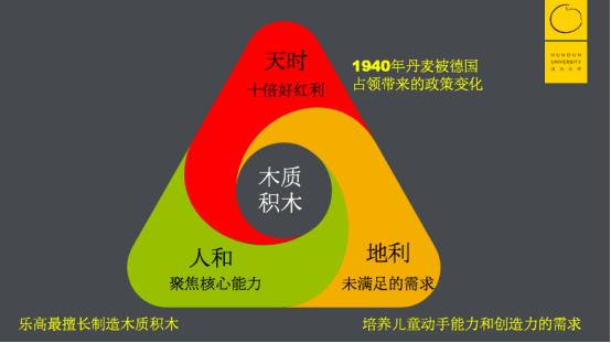 第一阶段乐高选择的单点是“木质积木”。这个单点是如何找到的?我们用“天时地利人和”的模型来分析。