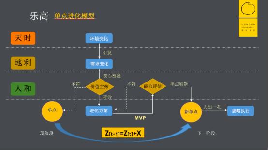 在天时这个维度上,环境发生变化,就会引发用户需求的变化;用户的需求发生改变之后,作为企业不应该马上去追逐用户的新热点,企业应该要到黄色的菱形去做判断,去和价值主张做比较,检验企业的初心,看一下如果转过去是否合适,或是否满足企业的价值主张,如果不满足,那就回到原来的单点,继续做老本行;如果满足企业的价值主张,就可以给出一个单点的进化方案,跑一个MVP来测试一下企业的能力,看能不能覆盖这么大的单点,如果不能覆盖这么大的单点,就重新去做单点的进化方案;如果企业的能力可以覆盖这个单点所需要的能力,就毫不犹豫地去做单点刷新,做出新的单点;然后在更大的打击面积上力出一孔去做战略执行,这就是乐高单点进化模型。