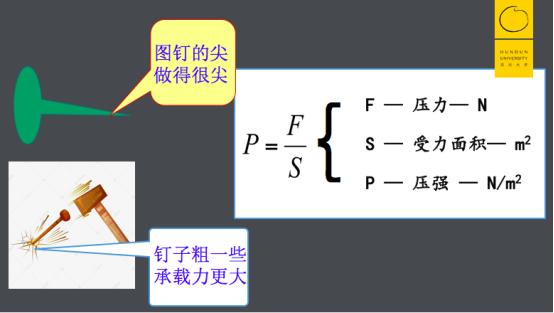就像我们去比较图钉和钉子,图钉可以用手按在墙上,为什么?因为图钉做得很尖,受力面积小。但是钉子不可以拿手按下去,因为钉子做得粗一些,增大了受力面积,为了产生足够的压强刺穿墙面,我们就要增加压力。