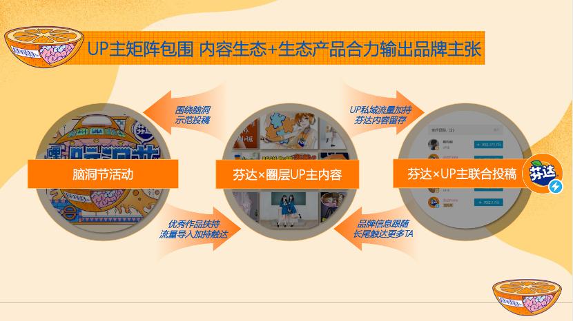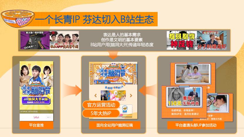 我们以芬达在B站的脑洞节营销为例,在常规营销思路下,快消饮品更多在于硬广内容输出以及KOL种草合作。但在B站平台中,芬达通过联合投稿、用户共创的方式,品牌与B站联合打造营销IP,激发用户创作IP内容,实现话题的圈层传播。值得一提的是,芬达在活动中采用了扭蛋机互动、定制化UP主内容等B站独有方式,最终收获了超1.9亿曝光。